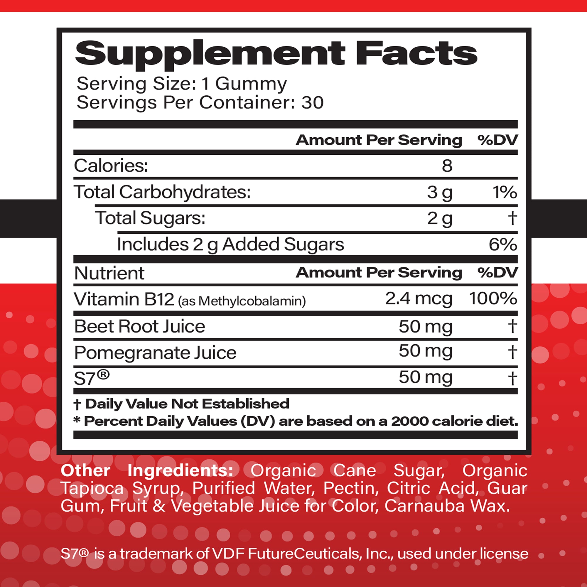 It's a gummy that is specifically designed to lower your blood pressure and give you vibrant energy. It contains patented natural mix called S7, a combination of natural ingredients proven to lower blood pressure levels. It also has a little pomegranate juice and beetroot powder.
